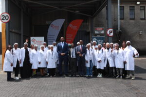 L-R: Co-Founder, TradeDepot and Chief Executive Officer, Africa Trade Engine (ATE); Deputy DG, Ministry of Trade & Industry South Africa; Mr Justice Ngwenya, and Chairman of Africa Trade Engine (ATE), Adam Molai, flanked by event guests after a factory tour during the ATE launch in South Africa