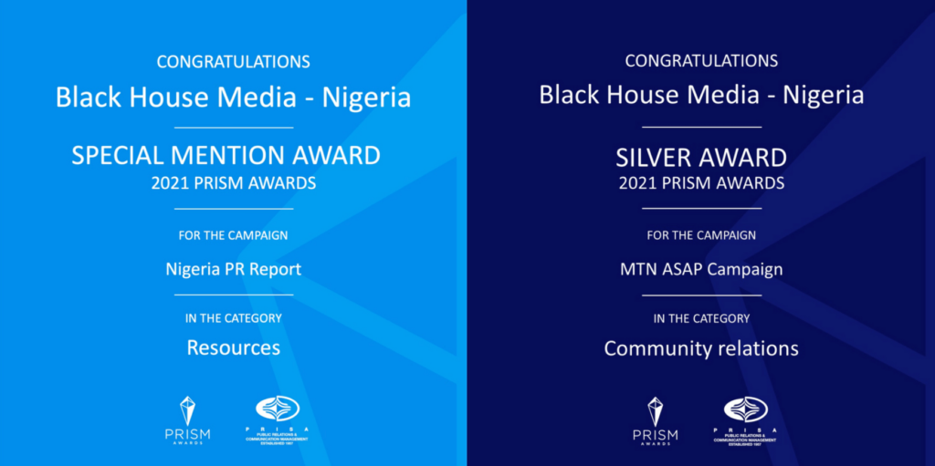 PRISM Awards, Africa’s most sought-after communications awards, has presented BlackHouse Media (BHM) Nigeria the Silver Award for its MTN ASAP Campaign in the Community Relations category and a Special Mention Award for the Nigeria PR Report in the Resources category. The PRISM “Silver” and “Special Mention” awards are considered a remarkable recognition of BHM’s […]