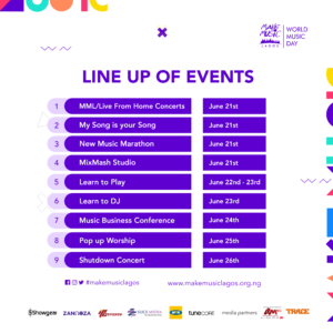 There you have it, Make Music Lagos is ready for you this week and whatever you do, do not miss out on all the events, excitement, and opportunities. Make Music Lagos is a member of the Make Music Alliance (the global body promoting the World Music Day with HQ in New York), and the organizing partners for 2021 are Showgear, Zannoza Entertainment, IPC events, Schullz66, Alienation, and IMPREVA. Supported by MTN, TuneCore & Slice Media. To know more about the lineup of events, please visit www.makemusiclagos.org or the official social media pages @makemusiclagos.