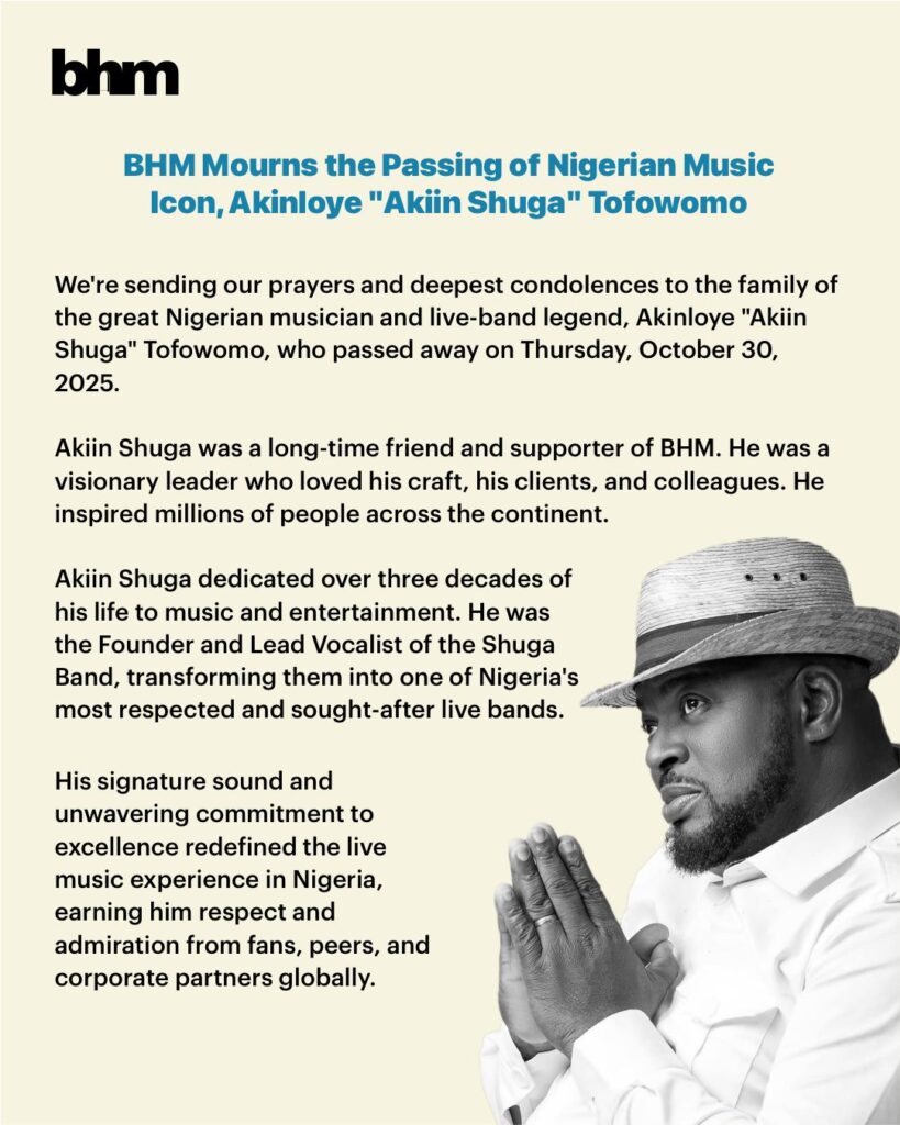 We’re sending our prayers and deepest condolences to the family of the great Nigerian musician and live-band legend, Akinloye “Akiin Shuga” Tofowomo, who passed away on Thursday, October 30, 2025. Akiin Shuga was a long-time friend and supporter of BHM. He was a visionary leader who loved his craft, his clients, and colleagues. He […]