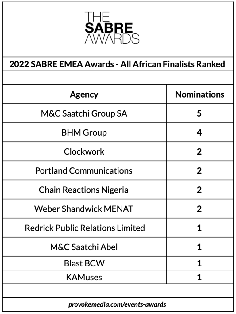 Speaking on the nominations, Paul Holmes, chair of the SABRE jury, said: “It is fair to say that we have never seen so much good work from so many firms, including international agencies with growing African operations, and indigenous firms from multiple markets.”